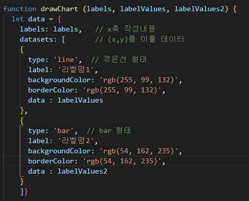 drawChart (labels, labelValues, labelValues2) // 호출
