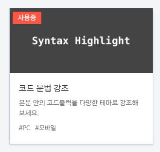 티스토리 플러그인을 검색하면 나오는 'Syntax Highlight' 이라는 플러그인을 사용해주세요.