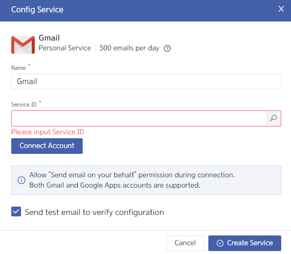 Connect Account를 통해 Gmail과 연동 후 Create Service