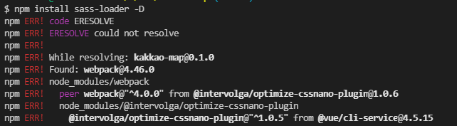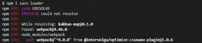 node-sass는 정상적으로 설치가 완료되었지만, sass-loader를 설치하지 못했다.