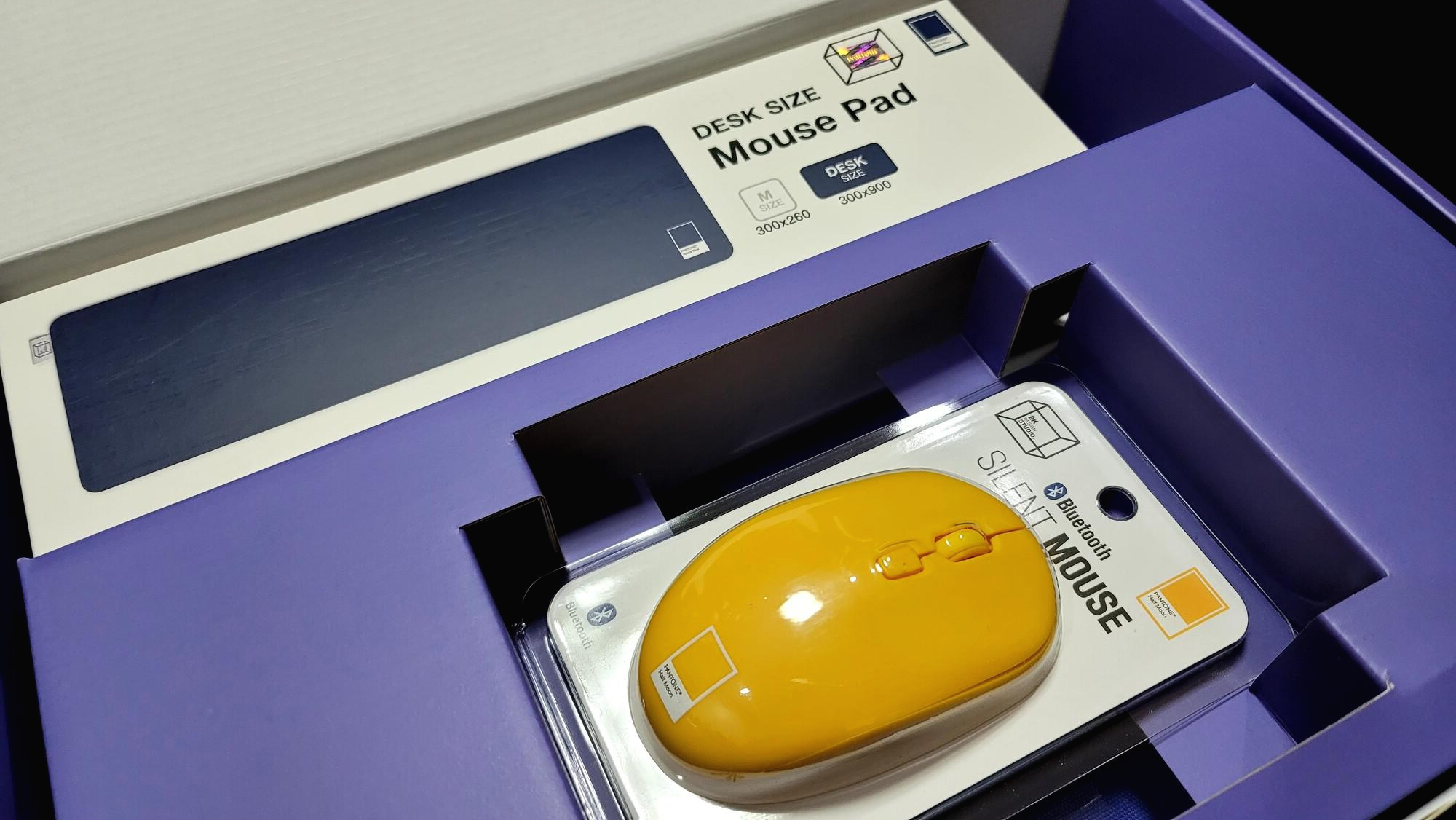 보라색의 배색에 위치한 노란색 무선 마우스도 왔어요!