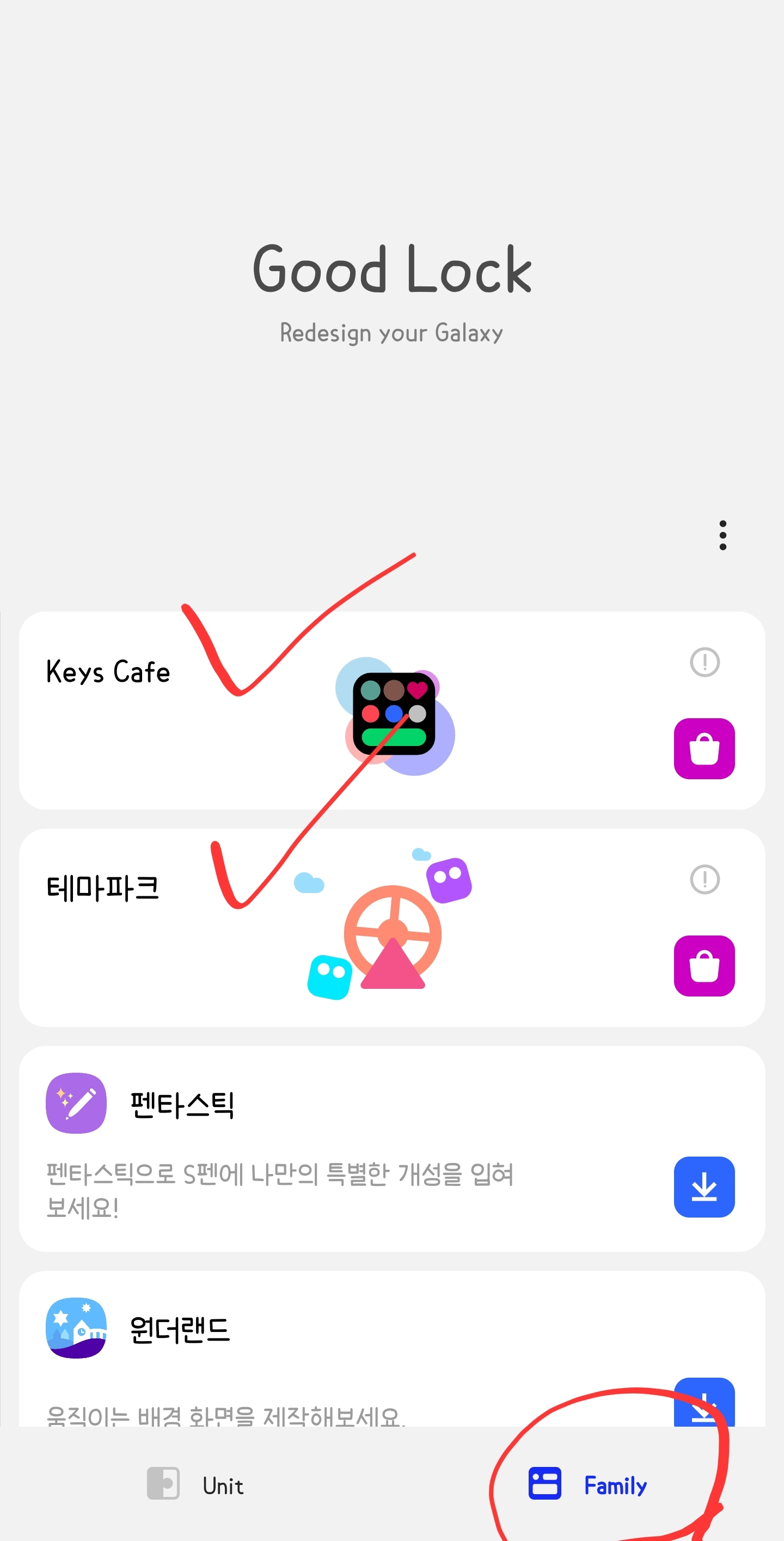 2. Good Lock에 들어가 Family 탭에 들어가서 해당 어플을 다운로드 받아주세요!