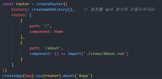 main.js 에 작성하였던 history: createWebHistory 부분 때문에 에러가 발생한 것 입니다.