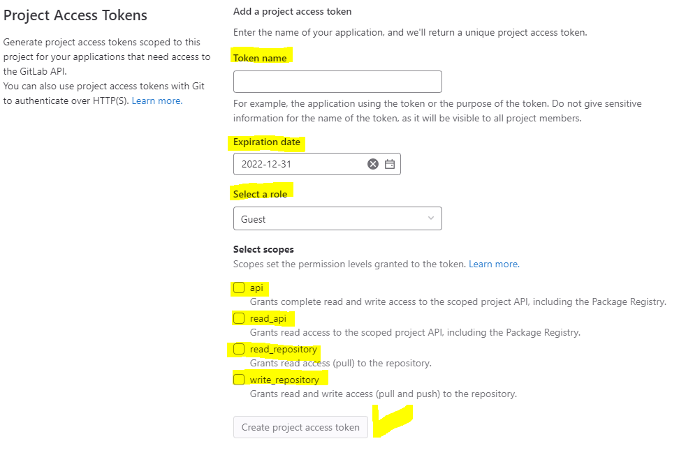 이 세가지를 모두 완료해주시고, [Create project access token] 을 눌러주시면 토큰이 생성됩니다.