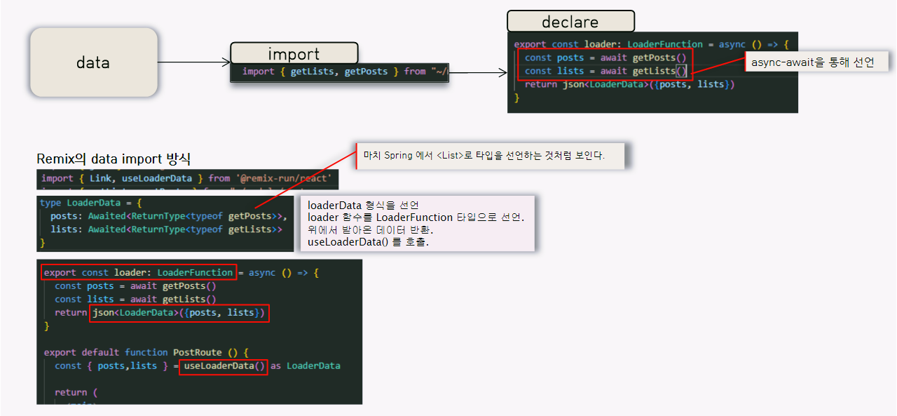 Remix 에서 데이터를 컴포넌트에 불러오는 방식을 위와같이 합니다.