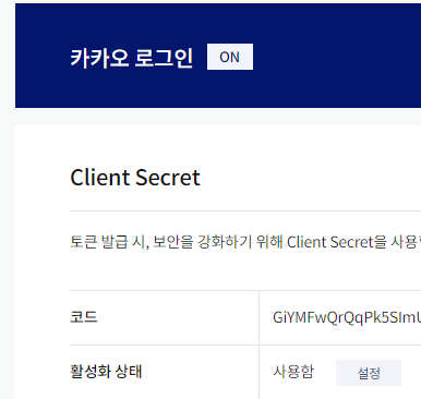 4) client_secret : 내 어플리케이션 > 제품설정 > 카카오로그인 > 보안 > ClientSecret : 코드