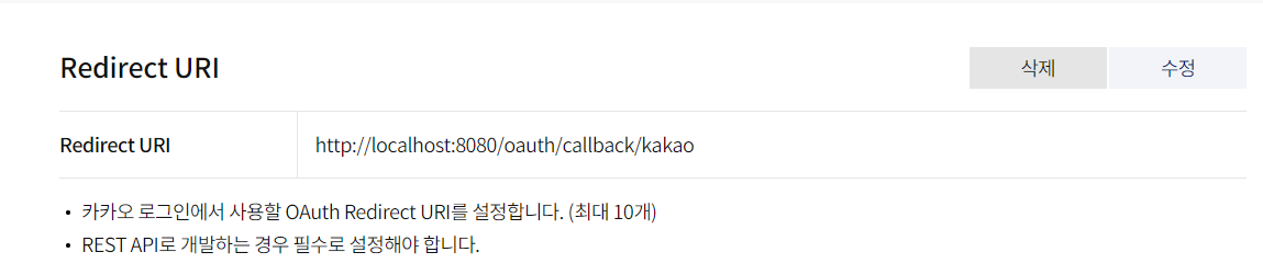 2) redirect_uri : 내 어플리케이션 > 제품설정 > 카카오로그인 > Redirect URI
