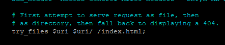 저는 저 try_files 부분에서 index.html 로만 작성이 되어져 있었기에