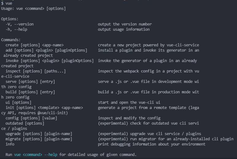 - 커맨드 창에 "vue" 라고만 작성해봅니다. (뷰 명령어를 사용할 수 있는지 확인)