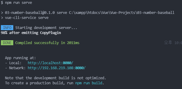 생성한 프로젝트로 이동하시고, npm run serve를 하면