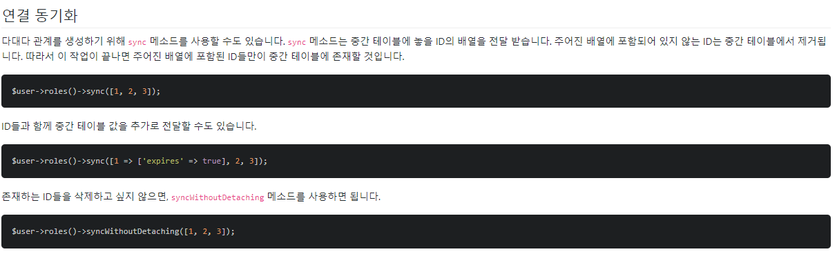 바로 attach, detach, sync, syncwithOutDetaching 등으로 사용할 수 있는데요,