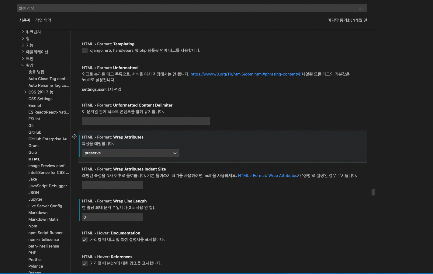 1. 설정(Setting) - 확장(Extension) - HTML 항목