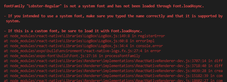 'Lobster Regular' 이라는 구글 폰트명으로 폰트를 설정하려고 하는데 expo 설정과 연동하여도 에러가 발생하였다.