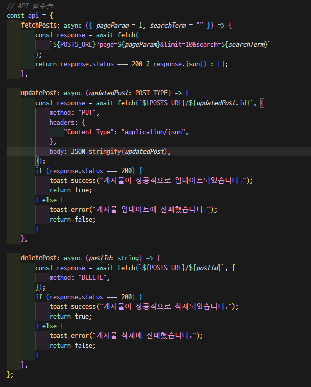 전역변수로 api 상수를 선언하고 그 안에 [조회, 수정, 삭제] 가 가능한 로직을 만들었습니다.